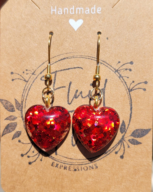 Handmade Sparkling Red Heart Earrings on Gold Hooks