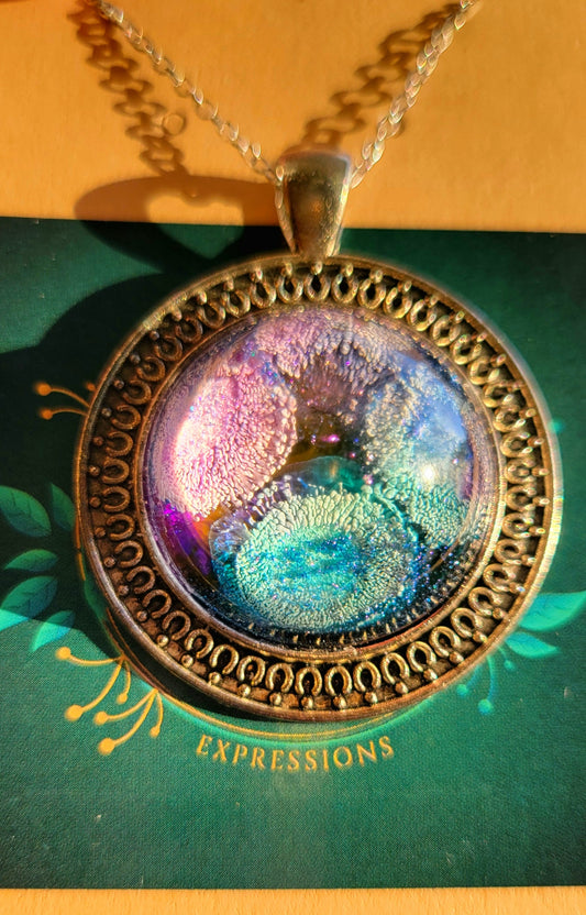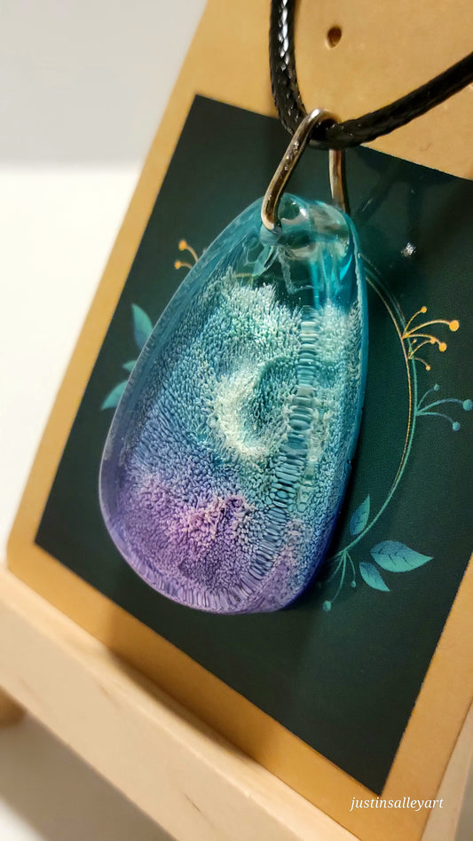 Handmade Resin Art Pendant "Anemone Garden" with 18 inch silver plated necklace chain.