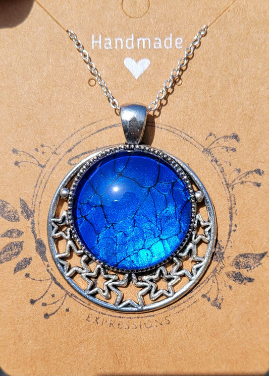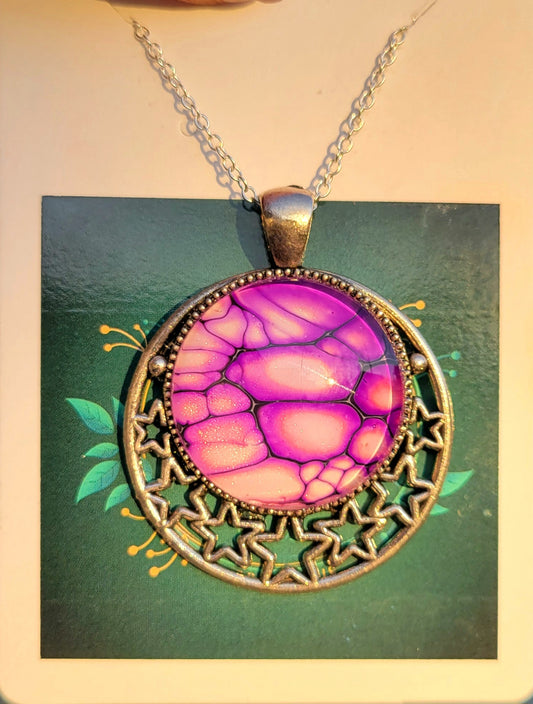 Handmade Fluid Art Pendant with stars and 20 inch silver plated necklace chain