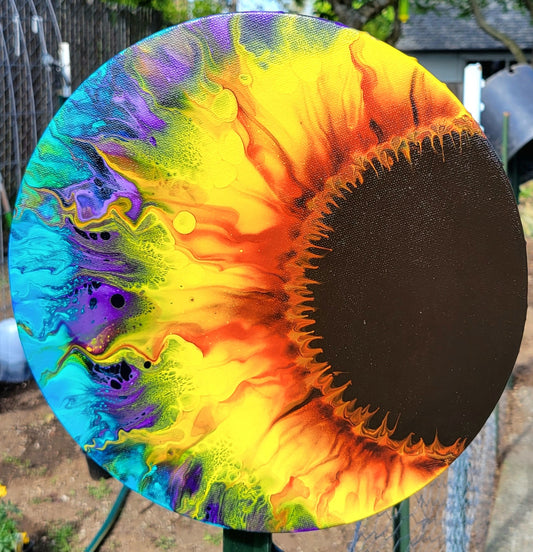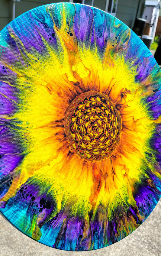 Original Fluid Art Sunflower on a 12 inch Round Canvas