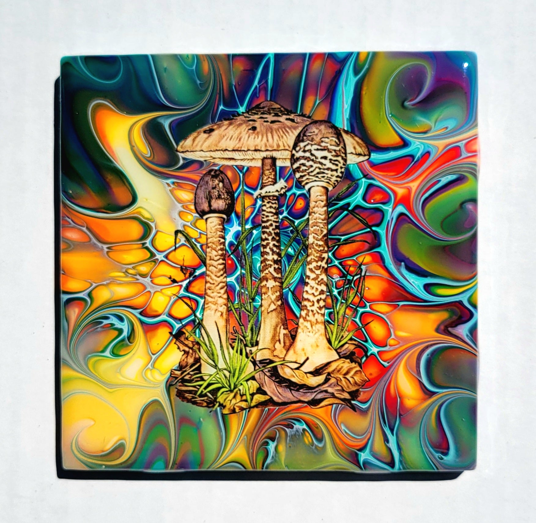 Bring a splash of color to any desk, tabletop or countertop with this vibrant Fluid Art Bloom on a 4.25 inch tile. Sealed with epoxy resin for a glass like finish. Complete with a cork bottom.