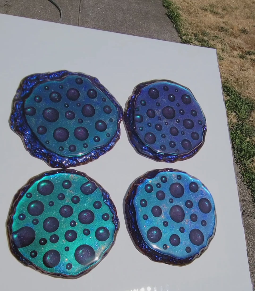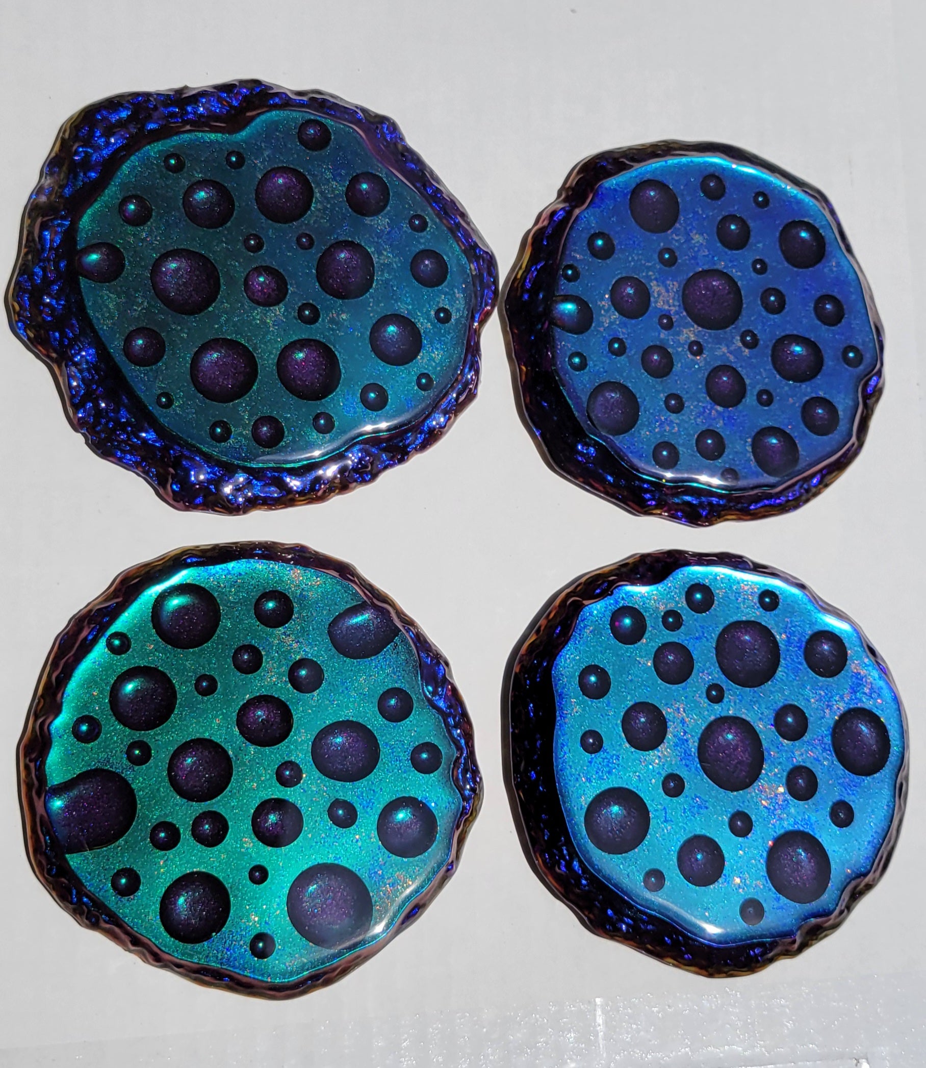 Handmade, resin art, colorshifting coasters-set of 4. Colorshifting pigments and FOOD GRADE epoxy resin used to create these (see pic). Each piece was handmade with love and finished with cork bottoms.