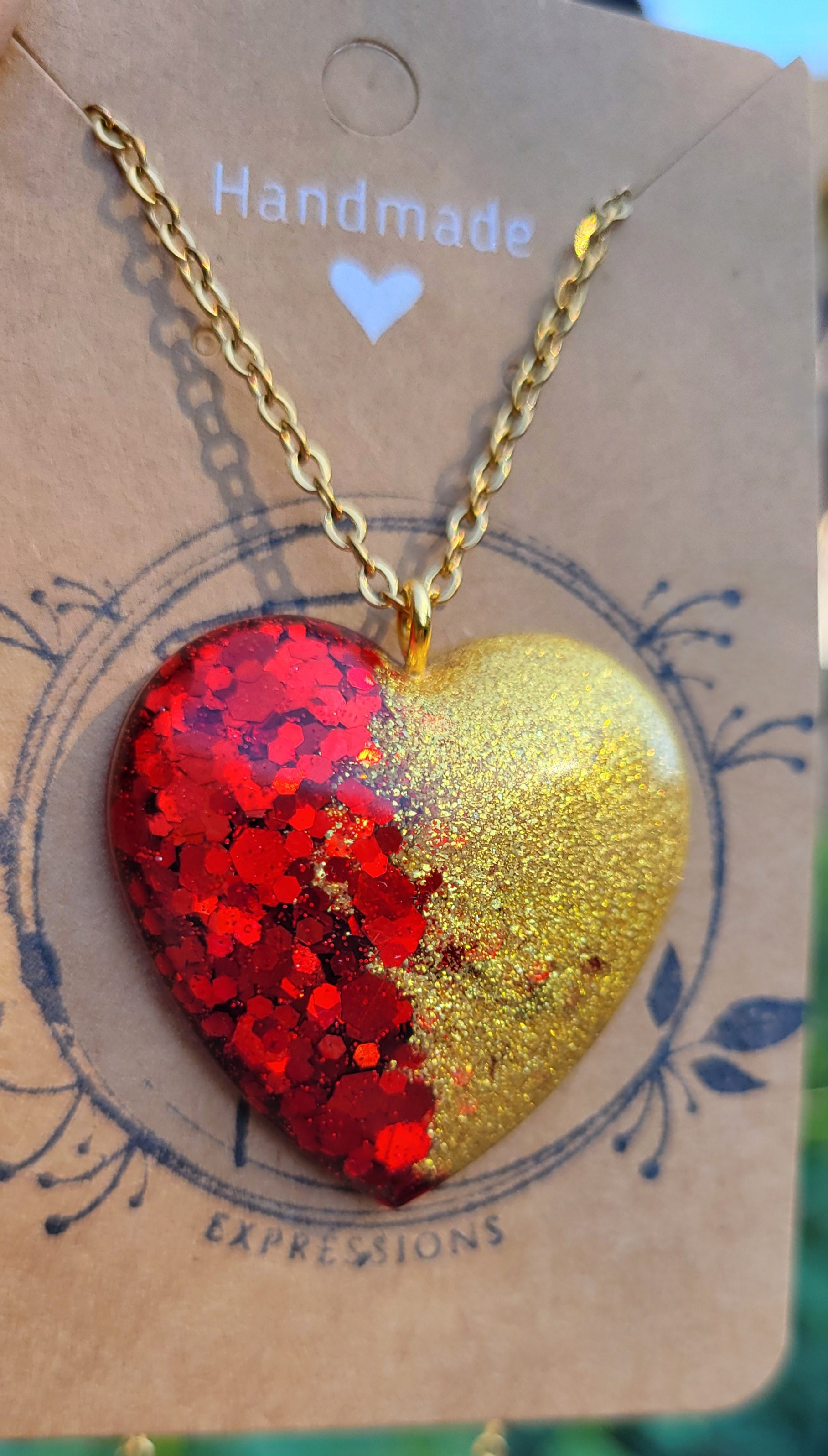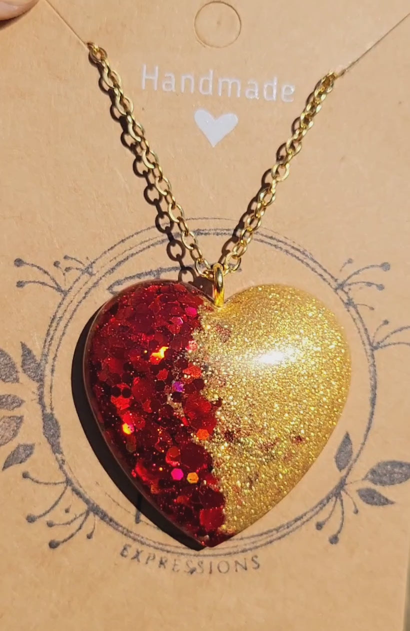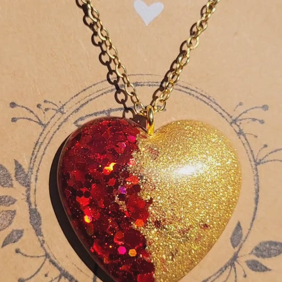 Handmade sparkling red and gold heart pendant on a Gold 20 inch necklace chain with lobster clasp. Pendant is made with food grade resin and sparkling red glitter and gold mica powder.